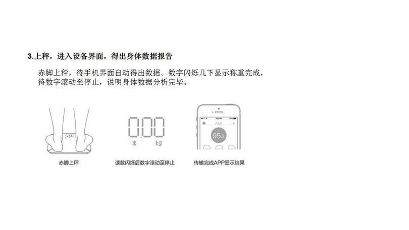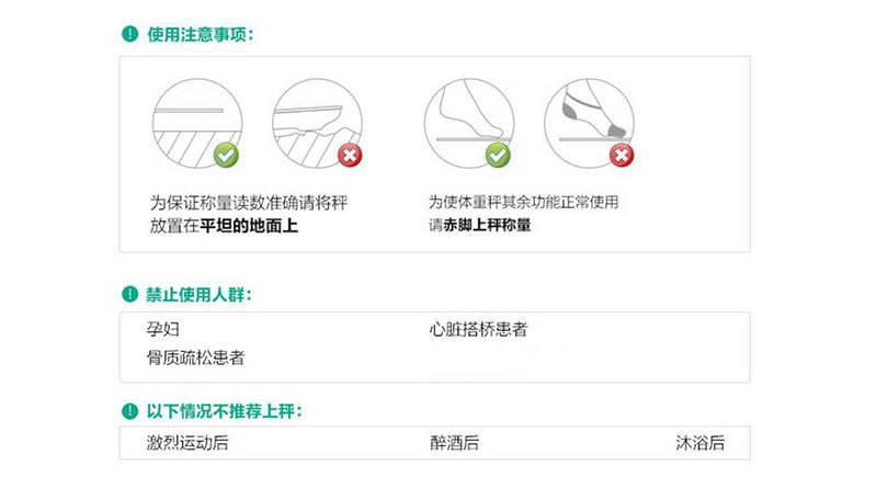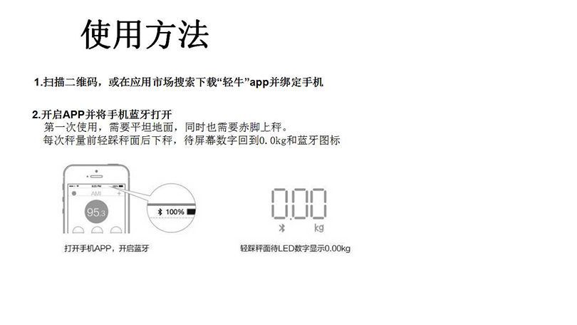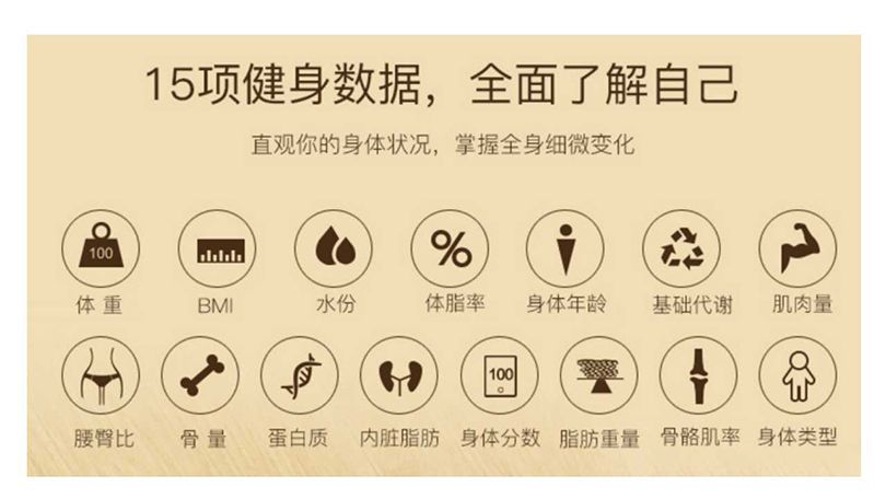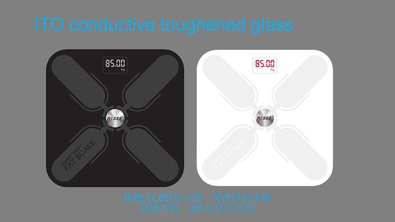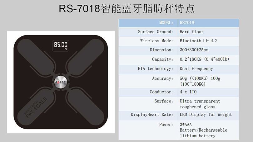 秤面:平面 無線鏈接:無線藍(lán)牙4.2,可定制WiFi連接功能 尺寸:300*300*25mm 容量:0.2~180KG (0.4~400lb) BIA技術(shù):雙頻率 準(zhǔn)確性:50g (<100KG) 100g (100~180KG) 面板材料:4*ITO 玻璃材料 表面:光滑高硬度鋼化玻璃 顯示屏幕:LED顯示屏的重量 供電方式:3 * AAA電池/充電鋰電池